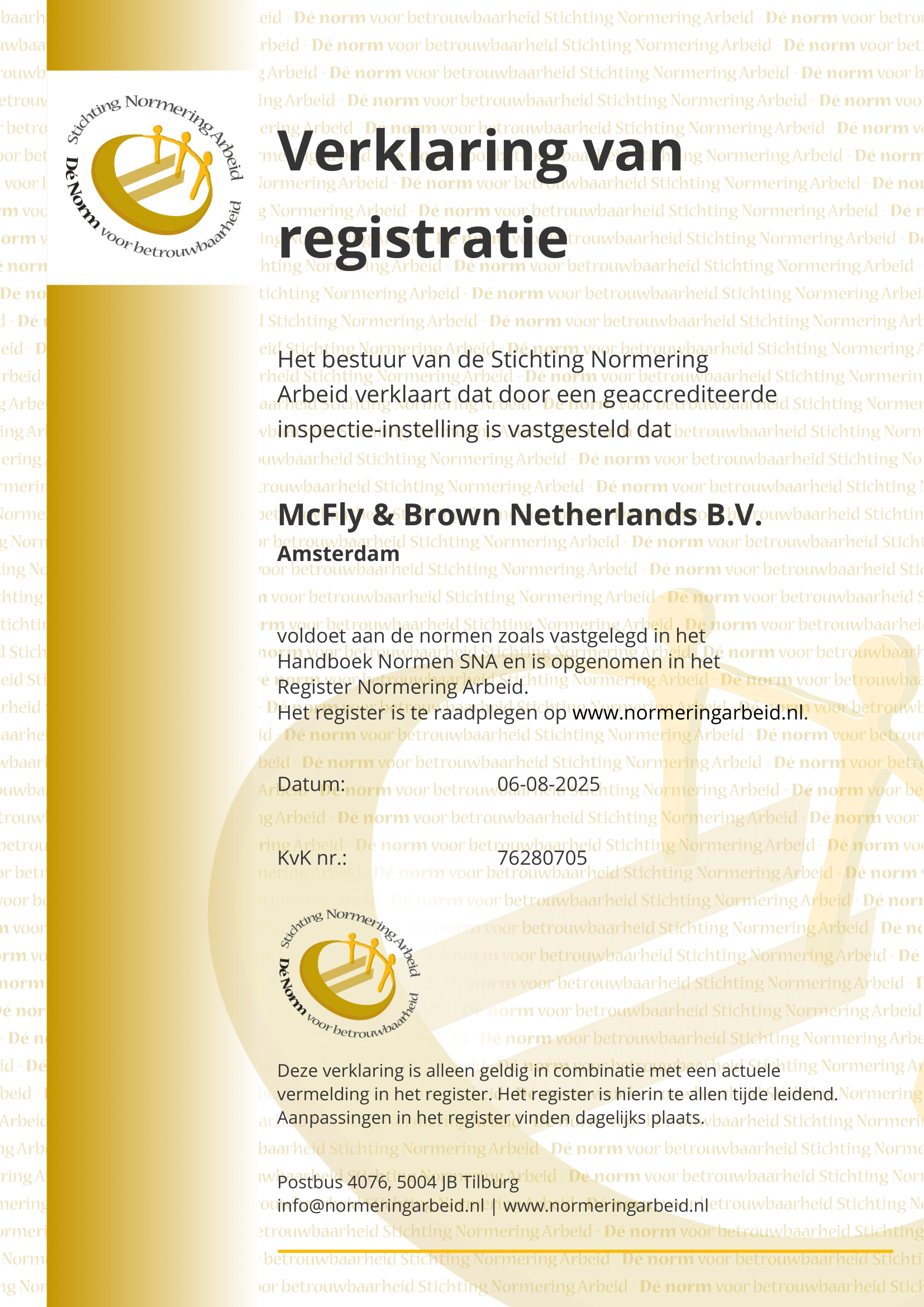 Bij McFly & Brown geloven we in kwaliteit, betrouwbaarheid en transparantie. Daarom zijn we trots dat we het SNA-keurmerk dragen, hét keurmerk van de Stichting Normering Arbeid.